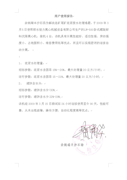 余姚瑞豐沙石場為解決選礦尾礦泥漿廢水處理難題,于2009年3月5日使用麗水恒力離心機械設備有限公司生產的LW-500臥式螺旋卸料沉降離心機,裝機4臺,該機具有分離性能好、適應性強、勞動強度小、占地面積小、維修費用低等優(yōu)點,而且可以實現密閉的連續(xù)自動分離。