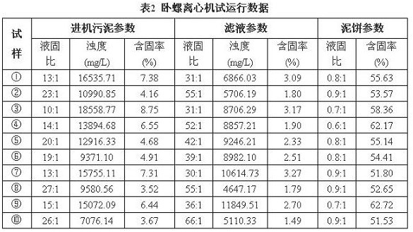 試運(yùn)行期間,進(jìn)機(jī)污泥參數(shù)變化不大,離心機(jī)各項參數(shù)基本保持為:污泥流量20m3/h、差速8r/min、轉(zhuǎn)速1800r/min、主機(jī)電流30A。試運(yùn)行數(shù)據(jù)見表2。