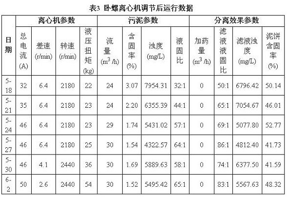 在參數(shù)的摸索調(diào)節(jié)中,轉(zhuǎn)鼓轉(zhuǎn)速過大會造成離心機(jī)本體的磨損和增加動力消耗,轉(zhuǎn)速過小,達(dá)不到處理效果,在前期運(yùn)行轉(zhuǎn)速1800r/min的情況下,適當(dāng)調(diào)節(jié)到2100~2500r/min范圍內(nèi);同時結(jié)合污泥含固率的減少和物料的難分離特性,將差速由前期的8r/min降低到2.5~6r/min范圍內(nèi),延長固體顆粒在離心機(jī)內(nèi)的停留時間。調(diào)節(jié)后運(yùn)行數(shù)據(jù)見表3(選擇上午8時數(shù)據(jù))。