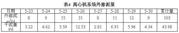 2009年4月24日,新建臥螺離心機(jī)項目投入試運(yùn)行,試運(yùn)行工藝流程大致同圖2,離心機(jī)上清濾液不經(jīng)過溢流水箱和溢流水泵到16米沉降槽,直接經(jīng)過排水管排入下水道。
